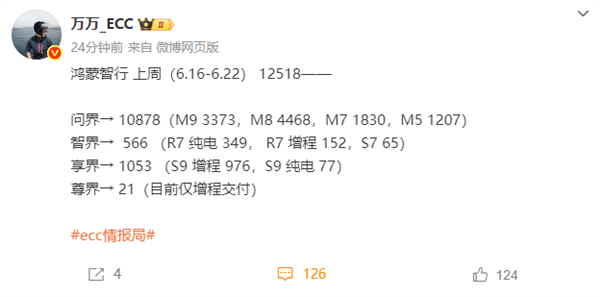 据博主“万万_ECC”曝光的数据流露,在刚刚罢休的上一周(6月16-22日),问界单周1.09万辆再次成为了新势力销量第又名,而鸿蒙智行阵营统共为12518辆。